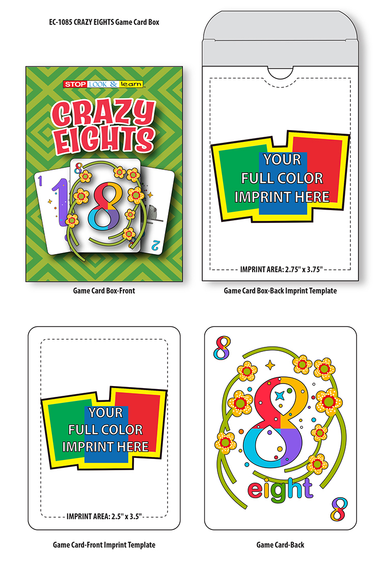 NEW! Flash Card Game Set - Crazy Eights. Boxed set of 36 Game Cards in fully customizable card box. Enjoy the classic card game with children and friends alike. Recommended for children ages 3 and up. This product is also ideal for schools, libraries and educations programs for young learners.